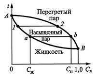Понятно, что при нагреве до температуры насыщения (например, до температуры точки а) жидкая смесь начинает кипеть, но интенсивность парообразования каждой из составляющих этой смеси неодинакова, и та из них (в данном случае хладагент), температура кипения которой ниже, выкипает интенсивней. В результате при равновесном состоянии системы жидкость–пар концентрация хладагента в паровой фазе СП будет намного большей, чем концентрация его СЖ в жидкой смеси (точка b). Состояния сухого насыщенного пара смеси отражены линией АbВ. Если сухой насыщенный пар нагревать далее, образуется перегретый пар с определенной концентрацией компонент. Область такого пара расположена выше линии АbВ. В процессе кипения в закрытой системе концентрация хладагента уменьшается, так что процесс идет от точки а к точке 1 с повышением температуры насыщения.