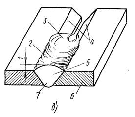 Рис. 15. Внешний вид соединения, 1—выпуклость шва, 2 — сварной шов, 3—сварочная ванна, 4—кромки, 5 — металл шва, 6 — основной металл, 7 — корень шва.
