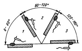 Рис. 15. Расположение сварного шва в пространстве: 1 — нижнее; 2 — вертикальное или горизонтальное; 3 — потолочное.