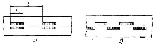 а — цепной, б — шахматный, l — длина провариваемого участка, t — шаг шва.