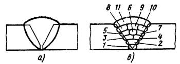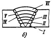 а — однослойные, б — многослойные, в — многопроходные, I—VI — слои;