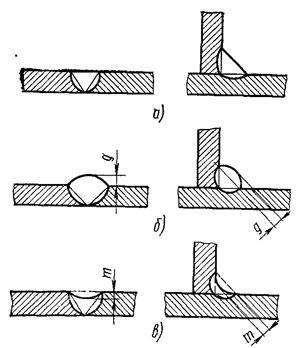 Рис 19. Нормальный (а), выпуклый (б) и вогнутый (в) швы g — выпуклость шва, m - вогнутость шва.