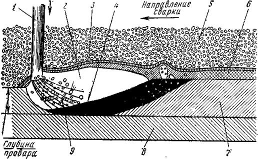 Отличительной особенностью процесса автоматической и механизированной сварки под флюсом является то, что сварочная дуга горит не на открытом воздухе, а под слоем сыпучего зернистого флюса. Под действием теплоты дуги 9 расплавляются основной металл 8, электродная проволока 1 и часть флюса 5, непосредственно прилегающего к зоне сварки. Электродная проволока подается вниз в зону сварки со скоростью ее плавления, плавится и переходит в шов в виде отдельных капель. Одновременно с этим проволока передвигается вдоль свариваемых кромок, в результате чего происходит процесс сварки. Расплавленный флюс образует плотную эластичную оболочку — флюсогазовый пузырь 2, поверх которого находится слой жидкого шлака 3. Флюсогазовый пузырь надежно защищает расплавленный металл от вредного воздействия кислорода и азота воздуха, а также предохраняет его от разбрызгивания. Во флюсогазовом пузыре создается большое давление газов, которое оттесняет часть жидкого металла 4 в противоположную направлению сварки сторону. После остывания жидкого металла образуется сварной шов 7, покрытый затвердевшей коркой шлака 6. Прослойка жидкого металла между дугой и дном сварочной ванны обладает малой теплопроводностью, поэтому величина ее оказывает большое влияние на глубину провара. Чем толще эта прослойка, тем меньше теплота дуги будет воздействовать на основной металл и тем меньше будет глубина провара, и наоборот. При этом изменяются высота и ширина выпуклости шва.