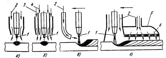 Рис. 2. Подача защитных газов в зону сварки: а — центральная одним концентрическим потоком; б — центральная, двумя концентрическими потоками; в — боковая; г — в подвижную камеру (насадку). Где:1 — электрод; 2 — защитный газ; 3 и 4 — наружный и внутренний потоки защитных газов; 5 — насадка; 6 — распределительная сетка.