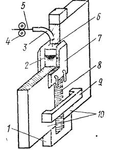 1 — начальная скоба для возбуждения процесса сварки, 2—металлическая (сварочная) ванна, 3 — токоподводящий мундштук, 4— подающие ролики, 5 — электродная проволока, 6 — шлаковая ванна, 7 — медные формующие ползуны, 8 — сварной шов, 9 — сборочная скоба, 10 — свариваемые детали.