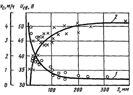 Рис. 6. Зависимость скорости сварки (1) и напряжения (2) от толщины соединяемого металла
