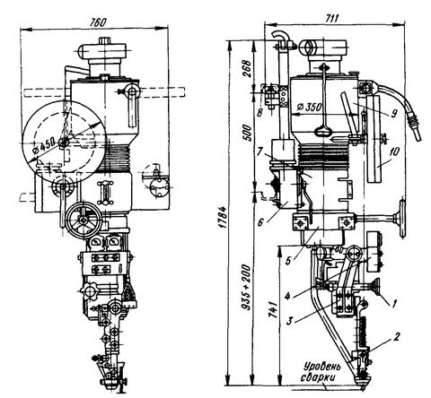 Самоходная тележка 6 служит для передвижения головки вдоль шва. Она представляет собой трехроликовую тележку велосипедного типа, которая движется по рельсовому пути 8, состоящему из двух швеллеров. Тележка приводится в движение от асинхронного двигателя. Для передвижения головки вручную предусмотрено отключение бегунков от привода при помощи ручного фрикционного механизма.