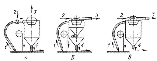 а — непрерывной циркуляции (смешанная система); б—периодической циркуляции (всасывающая система); в — без циркуляции (всасывающая система). 1—смесь воздуха с флюсом, 2 — сжатый воздух; 3 — выход чистого воздуха; 4 — ссыпка флюса.