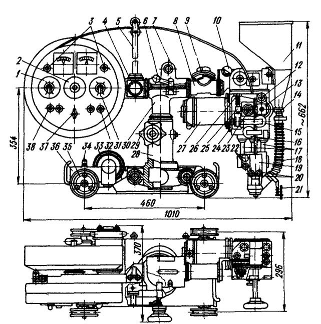 На пульте управления смонтированы: амперметр и вольтметр для измерения сварочного тока и напряжения дуги, потенциометр 1 для регулирования напряжения дуги, потенциометр 31 для регулирования скорости сварки, кнопки 32 для дистанционного регулирования сварочного тока, кнопки 38 для установочного перемещения электрода вверх и вниз перед началом сварки, кнопки 3 'пуск' и 'стоп' для пуска и прекращения работы автомата, переключатель 37 для управления ходом каретки 'вправо' или 'влево' и выключатель холостого хода каретки 2.
