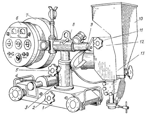 Рис 49 Сварочный трактор АДС-1000-2: 1- тележка; 2 - механизм поперечной корректировки; 3 – стойка; 4 – рукоятка муфты; 5 – зажим стойки; 6 – пульт; 7 – кассета; 8 – зажим коромысла; 9 – коромысло; 1- - бункер; 11 – рукоятка; 12- механизм вертикальной корректировки; 13 - сварочная головка.