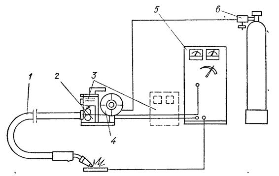Рис. 1. Конструктивная схема шлангового полуавтомата: 1— горелка со шлангом; 2— подающее устройство; 3 - подающее устройство с редуктором и роликом и системой управления, 4 — катушка; 5 — источник сварочного тока;6 — система подачи газа.