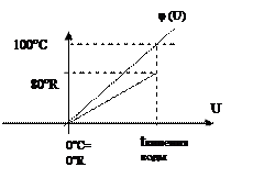 принята температура замерзания воды, но масштаб единиц измерения температур (градусов) у этих шкал разный. Очевидно, градус по Реомюру более весомый, чем по Цельсию. Чтобы найти соотношение ∆10С/∆10R между этими градусами, воспользуемся соответствием диапазонов температур между точками кипения и замерзания воды для каждой шкалы 1000С – 00С = 800R –00R, откуда следует, что ∆10С/∆10R = 80/100 = 0,8, то есть изменение температуры на один градус Цельсия соответствует изменению температуры на 0,8 градуса Реомюра. Таким образом, температуры этих двух шкал с разным масштабом единиц измерения связаны соотношением t0 R.= 0,8*t0 C. Например, 600С соответствуют 0,8 х 60 = 480 R. В общем случае измерения U и φ(U) в разных шкалах отношений связаны соотношением j(U) = K * U, где К – коэффициент пересчёта масштабов единиц измерения. В нашем случае при пересчёте температуры по Цельсию в температуру по Реомюру К=0,8, при обратном пересчёте К=1/0,8 = 1, 25.