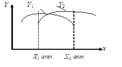 2. Проблема конфликтности. Пусть имеются два критерия Y1(x), Y2(x), зависящих от одной и той же переменной x. Проблема конфликтности заключается в том, что оптимальные значения критериев Y1 и Y2 получаются при разных значениях х (см. рисунок). Улучшение значения критерия Y2(x) ведёт к ухудшению значения критерия Y1(x) и наоборот – в этом заключается конфликт этих критериев. Одновременно получить наилучшие значения обоих критериев нельзя.