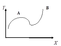 Рассмотрим, например, такую функцию (см. рисунок). Смысл понятия “точка оптимума” на этом графике определяется смыслом переменных X и Y. Пусть Y — доход, а X — расход. Точки оптимума будут разными для понятий X — неограниченный расход времени для получения максимального дохода (точка В) и X — ограниченный расход здоровья для получения дохода (точка А), так как для получения дохода, соответствующего точке В, здоровья может не хватить).