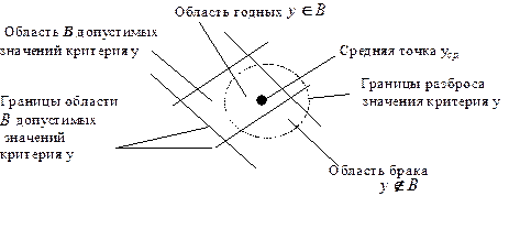 Как видно из рисунка, часть значений y попадает в область В (это годные схемы), а часть оказывается за её пределами (это брак). Тогда можно записать обобщенный критерий: