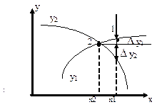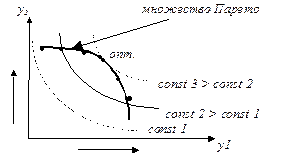 Для простоты положим a1 = a2 = 1. Тогда уравнение линий уровня критерия Y будет иметь вид: y1*y2=const. Отсюда получаем уравнение для y2 как гиперболу: y2=const/y1. Увеличение Y приводит к параллельному сдвигу гиперболы. Ее предельное положение (касание кривой Парето) дает оптимальную точку.