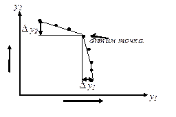 Выгодно сделать уступку по критерию y1 на D y1, так как при переходе из т.1 в т.2 выигрыш по y2 больше проигрыша по y1. Для успешного использования этого метода кривая, на которой лежат точки множества Парето, должна иметь излом. Точка излома — оптимальная.