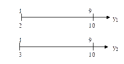 Соответствие значений критериев и их рангов (оценок предпочтений) отражено на рисунке, где внизу указаны значения критериев, а вверху — соответствующие им ранги. Наименьшее значение критерия у1, равное 2, является наихудшим и поэтому ему присваивается низший ранг, равный единице. Соответственно наилучшее значение у1, равное 10, получает высший ранг, равный 9, так как всего девять альтернатив. Остальные значения у1 получают промежуточные ранги, соответствующие порядковым номерам значений критерия у1..Аналогичное соответствие рангов и значений имеет критерий у2.