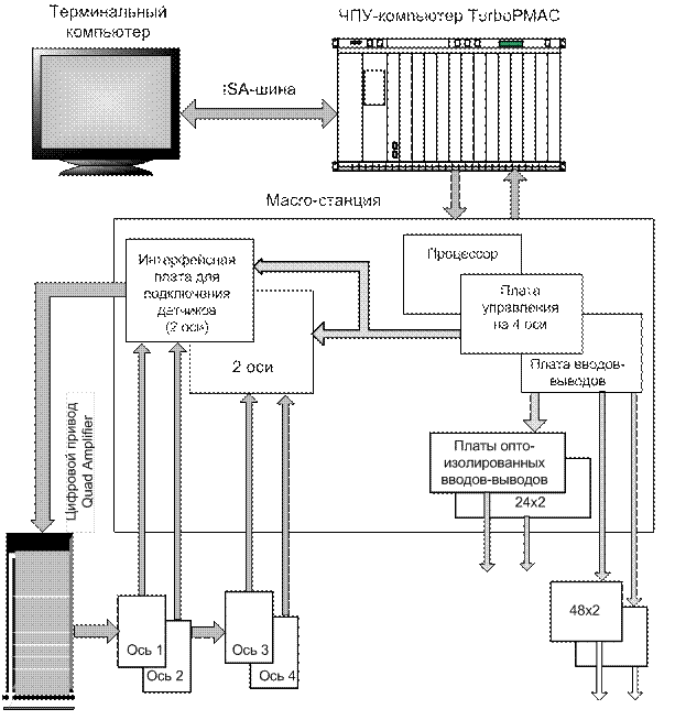 Одноплатный ЧПУ-компьютер РМАС на процессоре Motorola 56300 решает геометрические и логические задачи, выполняя функции интерполятора, контроллера управления приводами подачи и шпинделя, а также программно-реализованного контроллера электроавтоматики.