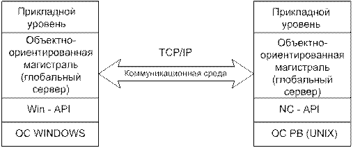В РС-подсистеме наиболее целесообразна операционная система Windows NT, а в NC-подсистеме – операционная система реального времени, например, UNIX. Обе операционные системы совместимы в том понимании, что поддерживают коммуникационные протоколы TCP/IP. Это позволяет построить коммуникационную среду, которая объединяет обе подсистемы. Включение в эту среду прикладного уровня с функциями доступа к интерфейсам модулей (а общее число таких функций может достигать нескольких сотен) создает виртуальную шину, которая обеспечивает низкоуровневые услуги доступа. Объектную надстройку в шине формирует глобальный сервер, т.е. единая для обеих подсистем объектно-ориентированная магистраль.