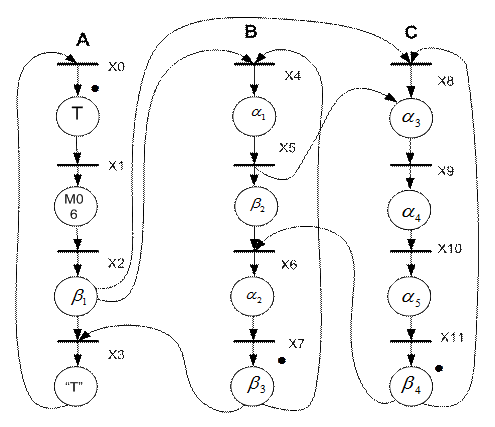 Условия для срабатывания перехода х3, формирующего сигналы на панель оператора о выполнении Т-команды, наступят после реализации процесса В.