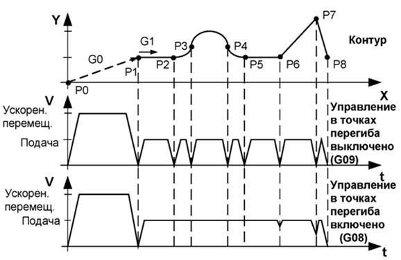 При активной инструкции G08 (управление в точках перегиба включено) конечная точка P8 будет достигнута за более короткое время, чем при активной инструкции G09 (управление в точках перегиба выключено). Обе инструкции модальны.