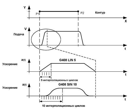 Параметрами инструкции служат LIN и SIN. Параметр LIN <число> служит признаком линейного изменения ускорения; причем <число> означает количество интерполяционных циклов (от 2 до 40), между которыми распределяется линейное изменение ускорение. Параметр SIN <числовое значение> служит признаком изменения ускорения соответственно функции sin2; а <числовое значение> является вариантом использования инструкции G408 (см. рис. 4.20):