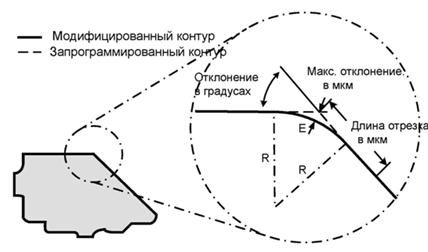 Инструкции G34 и G134 задают скругление на стыке двух кадров с прямолинейными участками, а инструкция G134 выполняет ту же функцию на стыке кадров с круговыми или винтовыми траекториями. В результате выравнивается скорость подачи, и соблюдаются ограничения на ускорение. С другой же стороны, в процессе интерполяции поддерживается минимальное отклонение от запрограммированного и скорректированного контуров. Параметры отклонения устанавливаются в машинных параметрах, но могут и быть изменены в управляющей программе.