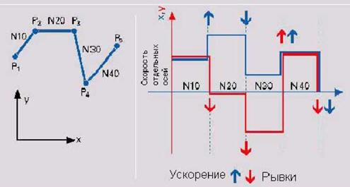 Динамика перемещений исполнительных органов станка при линейной аппроксимации носит "дерганый" характер (рис. 4.29). Все это приводит к механическому износу узлов и инструмента, а также к ухудшению качества обработанной поверхности. При использовании сплайновой интерполяции динамика приводов улучшается. На рисунке 4.30 показан пример плавного изменения подачи с использованием технологии NURBS – non uniform rational b-spline.