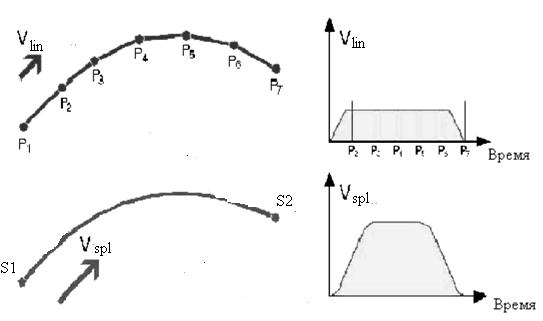 При более высокой путевой скорости сокращается время обработки и увеличивается производительность. На рисунке 4.32 показано два варианта интерполяции – линейная между точками Р1, Р2 …, Р7 и сплайновая между точками S1-S2.
