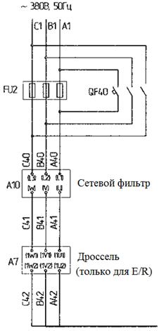 Для ограничения влияния преобразователя на сеть между сетью и модулем питания целесообразно включить сетевой фильтр и коммутирующий дроссель HF. Коммутационные дроссели HFD и импульсное сопротивление 1,5/25 кВт необходимы, если в структуре приводов находятся линейные приводы, тороидальные электродвигатели, двигатели иных производителей или возможны явления резонанса.
