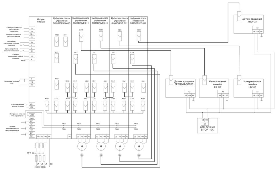 На рисунке 7.15 показана схема подключений приводной системы SINUMERIK 840D для фрезерного станка с ЧПУ.