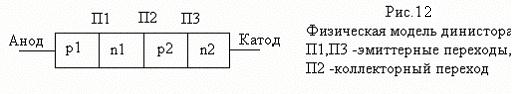 Тиристоры –полупроводниковые приборы,основанные на трех - переходной диодной структуре, подразделяются на три основные типа:динисторы, тринисторы (чаще называются просто тиристорами) и симисторы. Основное назначение – коммутация больших нагрузочных токов в широком диапазоне напряжений на нагрузке. На рис.12 показана физическая модель динистора,включающая три p-n перехода.