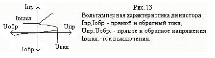 При некотором напряжении между анодом и катодом, называемом напряжением включения, в коллекторном переходе создаются условия для лавинообразного нарастания числа неосновных носителей в результате чего электрическое сопротивление динистора резко падает, возрастает прямой ток, величина которого теперь будет определяться сопротивлением последовательно включенной нагрузки и приложенным напряжением. Вольт-амперная характеристика динистора с характерными точками,определяющими параметры динистора приведена на рис.13.