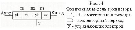 Тринистор отличается от динистора наличием дополнительного «управляющего» вывода, подачей напряжения на который, можно управлять моментом включения тринистора (Рис.14)