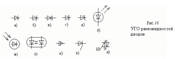 Условные графические обозначения диодов и их разновидностей приведены на рис.16.