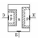 Эмиттер (Э) – это область с высокой концентрацией положительных носителей заряда-дырок, база (Б) - тонкая область между эмиттером и коллектором (К). Переход, который образуется на границе областей эмиттер-база, называют эмиттерным, а на границе база-коллектор – коллекторным. Площадь коллекторного перехода в несколько раз больше площади эмиттерного перехода.