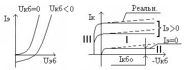 На семействе выходных характеристик выделяют три области: I – активная область усиления транзистора; II – область отсечки; III – область насыщения. Реальные выходные характеристики отличаются от теоретических тем, что при увеличении Uк наблюдается рост Iк. Это объясняется главным образом сужением базы при расширении коллекторного перехода под действием напряжения (Uк).Кроме того, через коллекторный переход протекает тепловой ток (Iкбо) связанный с наличием неосновных носителей в области базы и коллектора, концентрация которых увеличивается примерно в два раза при повышении температуры коллекторного перехода на каждые 100С за счет термогенерации. Тепловой ток коллекторного перехода влияет на аддитивную погрешность транзисторной усилительной схемы и это влияние необходимо учитывать при проектировании усилительных схем, работающих в широком температурном диапазоне. Транзистор, также как и любой электронный прибор, характеризуется предельными режимами, превышение которых приводит к нарушению работы прибора и выходу его из строя. Максимально допустимые напряжения ограничиваются пробивными напряжениями соответствующих переходов, максимально допустимые мощность и ток ограничиваются максимально допустимой температурой коллекторного перехода, не приводящей к тепловому пробою.