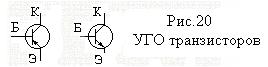 Условные графические обозначения транзисторов двух основных типов показаны на рис.20, в схемах УГО сопровождается буквенным обозначением транзистора «VT», в перечне элементов к электрической принципиальной схеме буквами «КТ»,например, КТ315.