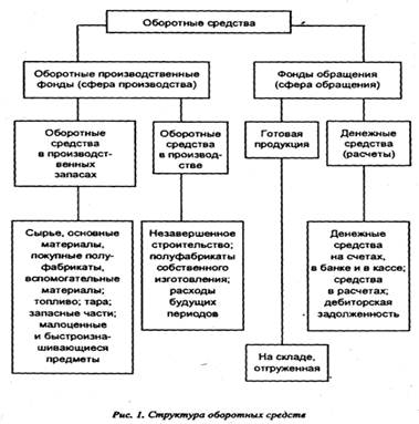 Оборотные средства - это совокупность денежных средств, авансированных для создания и использования оборотных производственных фондов и фондов обращения для обеспечения непрерывного процесса производства и реализации продукции (рис. 1).