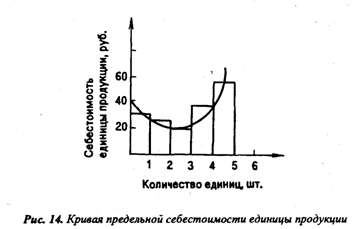 Из приведенных данных следует, что себестоимость единицы продукции, произведенной с помощью привлечения дополнительной рабочей силы, снижается до определенного момента, а затем снова начинает расти. Падение или рост себестоимости каждой дополнительной единицы продукции называется предельной себестоимостью (рис. 14).