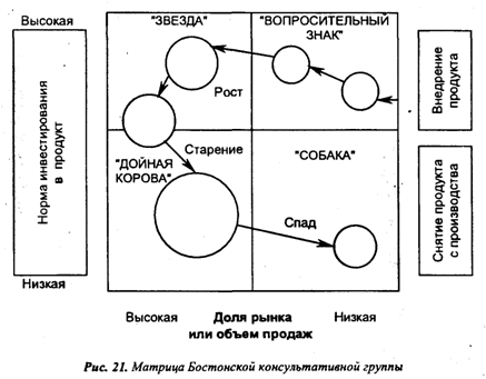 При анализе портфеля продукции, т.е. вариантов инвестиций, сравнивают долю фирмы или ее изделий на рынке с темпами роста всей хозяйственной деятельности. Здесь может быть использована матрица Бостонской консультативной группы (рис. 21), которая поможет при выборе той или иной стратегии. Например, если изделие фирмы занимает большую долю рынка и имеет высокие темпы роста ("звезда"), фирма скорее всего будет придерживаться стратегии роста, и наоборот, если изделие занимает малую долю рынка и имеет низкие темпы роста (" собака "), фирма может выбрать стратегию сокращения.