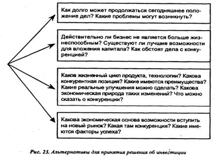 Рассмотренные выше показатели, судя по практическому опыту, не могут стать единственной основой для принятия решения об инвестировании. Здесь важно учитывать и другие факторы, которые не всегда поддаются количественной оценке, а требуют содержательного анализа: общей складывающейся экономической конъюнктуры, конкурентной среды, способности менеджеров осуществлять инвестиции, организационных моментов и др. При осуществлении капитальных вложений прежде всего необходимо уяснить, что дает предприятию их реализация, а также определить возможные альтернативы данных вложений. Американский ученый Э. Хелферт в работе "Техника финансового анализа" указывает: "Никакие существенные инвестиции не должны предприниматься до тех пор, пока анализ не даст ответ на первые два вопроса, представленные на дереве решений" (рис. 23).