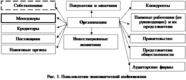 Пользователи экономической информации подразделяются на две группы: внешние и внутренние (рис. 1). К внутренним пользователям относятся менеджеры, все остальные - являются внешними пользователями информации предприятия. Собственники могут относиться к внутренним пользователям, если они участвуют в управлении предприятием. Указанные категории пользователей информации различаются целями ее получения и использования и предъявляемыми к ней требованиями.