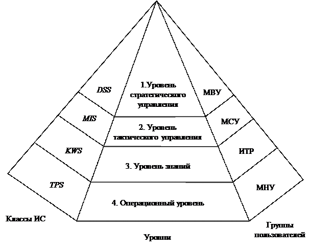 Применительно к промышленному предприятию классификация информационных систем в составе интегрированной во взаимосвязи с пользователями на различных уровнях управления, может быть представлена в виде следующей пирамиды (рисунок 1.6).