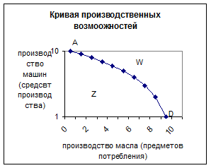 Точки, находящиеся вне кривой трансформации, к примеру точка W, оказались бы предпочтительнее любой точки на кривой. Но такие точки недостижимы при данном количестве ресурсов и при данной технологии производства. Барьер ограниченности ресурсов не допускает какого-либо сочетания производства средств производства и предметов потребления в точке, расположенной вне кривой производственных возможностей, т.е. точка W. Любая точка внутри кривой производственных возможностей показывает незанятость или неполную занятость ресурсов (Z). Продвигаясь к полной их занятости и полному объему производства, общество может производить большее количество либо одного, либо обоих продуктов. Эта точка показывает, что при использовании дополнительных ресурсов можно увеличить и производство масла и производство машин.