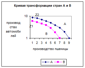 Производственный потенциал страны А выше, чем у страны В. Даже, если бы страна В решила полностью сосредоточиться на производстве только автомобилей, ее потенциал позволил бы ей достичь максимума в точке Z1. Страна А, поставив аналогичную задачу, достигнет максимума производства автомобилей в точке Z2, что объясняется превосходством ресурсно-технического обеспечения в сфере автомобилестроения страны А.