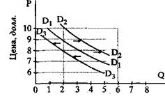Кривая D1d1 характеризует движение показателей суммарного спроса для 100 покупателей при разных значениях цен за единицу измерения приобретаемого материала или иного изделия. В любом значении суммарный спрос определяется путем умножения индивидуального значения цены покупки на число покупок. Последующее сложение полученных суммарных значений дает совокупный рыночный спрос (для нашего примера это: 1000 + 2000 + 3000 + 5000 = 11 000). Факторы, изменяющие спрос. В предыдущих рассуждениях исходили из того, что цена является главным и определяющим фактором при покупке товара. Это так, но цена никогда не выступает исключительным фактором, ибо может быть еще масса неценовых факторов, которые также воздействуют на покупательские склонности потребителя. Их обычно называют факторами изменения спроса. Под их влиянием кривая спроса DlDl (см. рис. 2) будет отклоняться вправо или влево, как это показано стрелками, и занимать позицию, например, кривой D2D2 или D3D3. Таких побочных факторов может быть множество, их обычно классифицируют и сводят в следующие важнейшие группы: прежде всего это вкусы, или предпочтения, потребителей; число потребителей на рынке; денежные доходы потребителей; цены на сопряженные товары; потребительские ожидания относительно будущих цен и доходов. Потребительские вкусы оказывают на спрос благоприятное либо неблагоприятное воздействие, Например, производитель в целях стимулирования продаж товара может выпустить его новинку, применить оригинальную рекламу или изменить упаковку, что обычно сопровождается развитием потребительского вкуса и ростом покупательной способности. В таком случае кривая D1D1 будет сдвигаться вправо и займет позицию кривой D2D2. Но изменим ситуацию: новинку применил не данный продавец, а его конкурент, и рекламу он применил более действенную, и упаковку товара сделал более эстетичную - тогда фортуна от первого продавца отвернется, спрос на его товар упадет, а кривая D1D1 сдвинется влево и займет позицию кривой D3D3. Поэтому за изменением вкусов потребителей очень четко следят маркетологи. Численность покупателей также оказывает воздействие на потребительский спрос: увеличение числа покупателей сопряжено с ростом спроса на продукцию и, наоборот, уменьшение количества покупателей снижает спрос, а следовательно, и размер производства, Поэтому зарубежная торговая сеть борется за каждого покупателя, совершенствует формы торговли, проводит торговые скидки с цен на товары в случае приобретения их крупными партиями, устанавливает надбавки к зарплате тем торговым работникам, которые применяют новые формы обслуживания населения, и т.д.