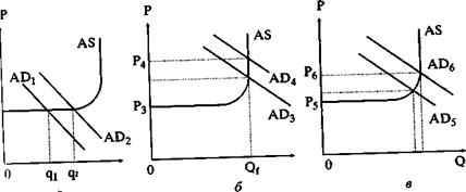 Рис. 23. Последствия увеличения совокупного спроса: а — на кейнсианском отрезке кривой; б — на классическом отрезке кривой; в - на промежуточном отрезке кривой