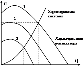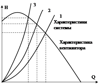 Рис.1. Характеристики вентилятора и системы при регулировании шибером